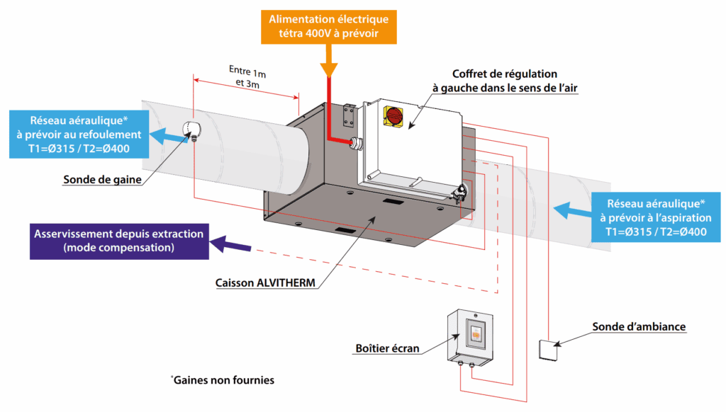 - Utilisation possible en compensation, asservie à une extraction de cuisine (entrée 0-10V).